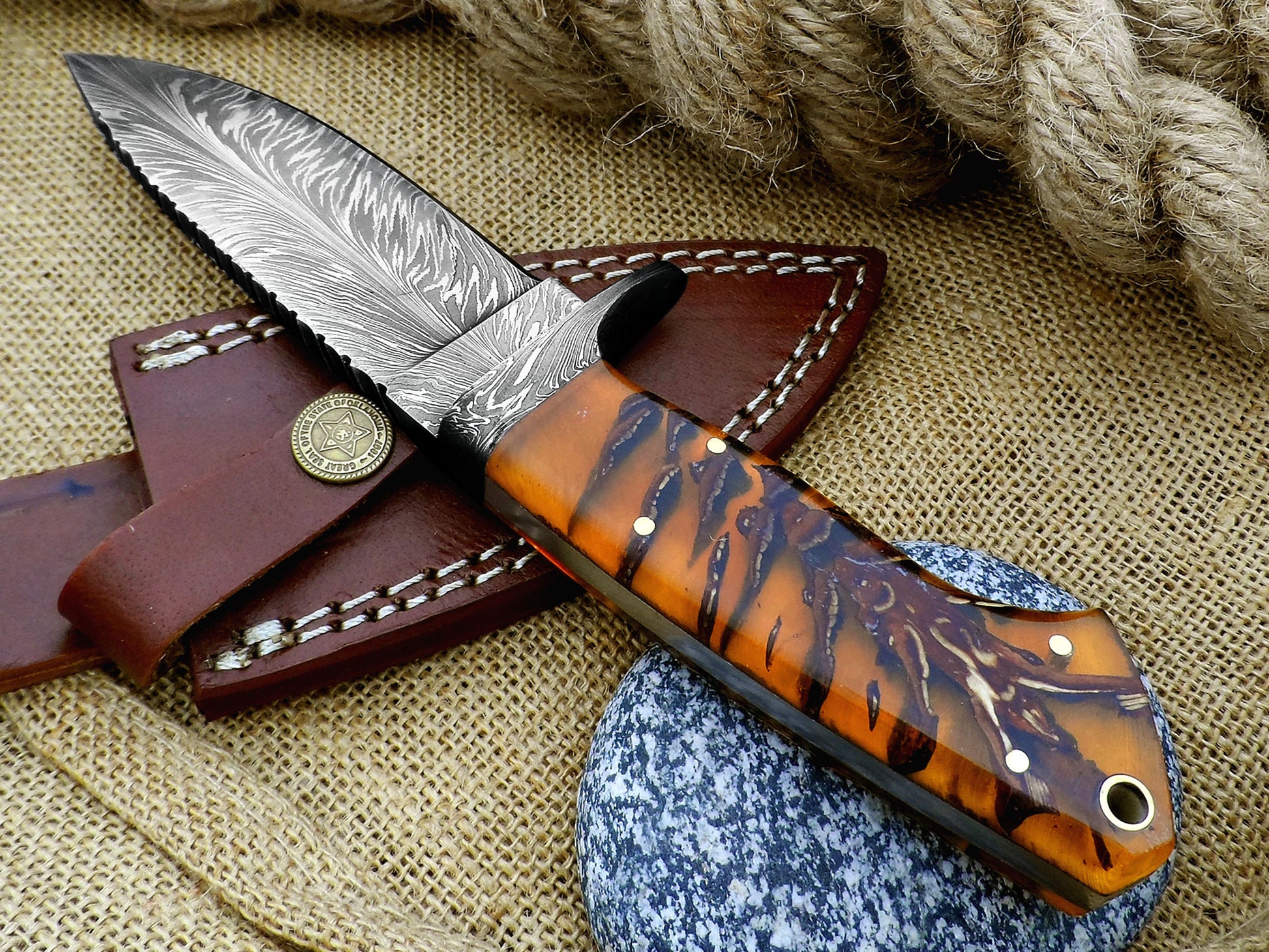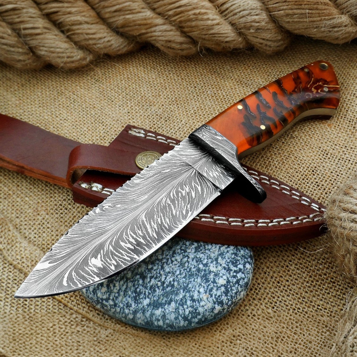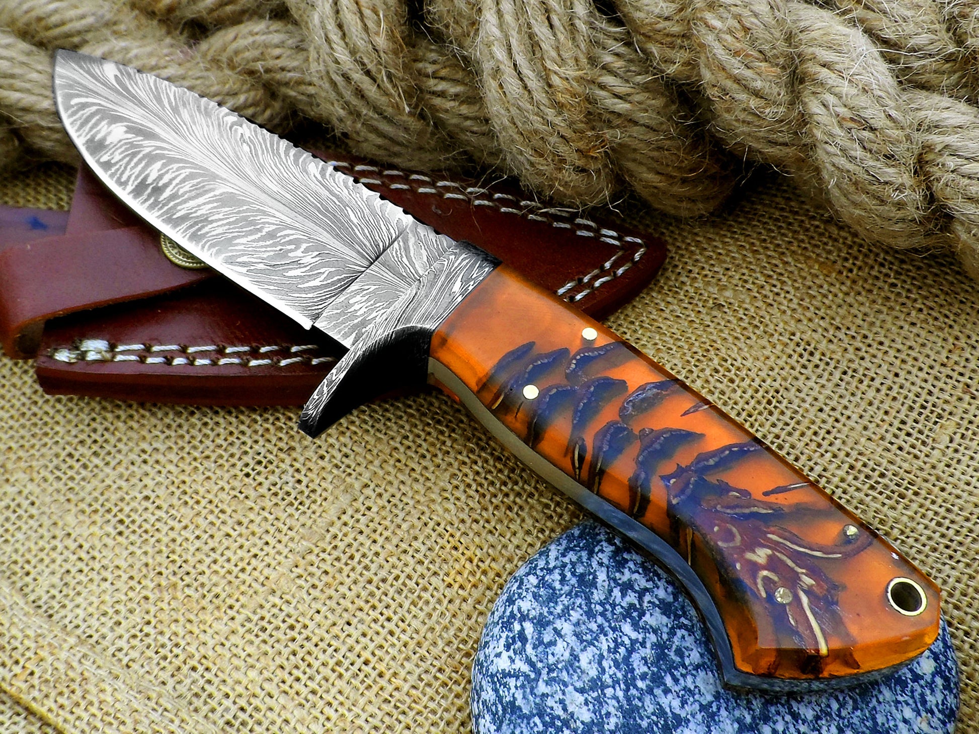 A handmade Damascus skinning knife has a handle made of stabilized pinecone resin. It features a feather pattern Damascus blade and comes with a custom leather sheath. This full tang hunting knife is made for hunters, collectors, and outdoor adventurers. It combines beauty with high performance in the field.