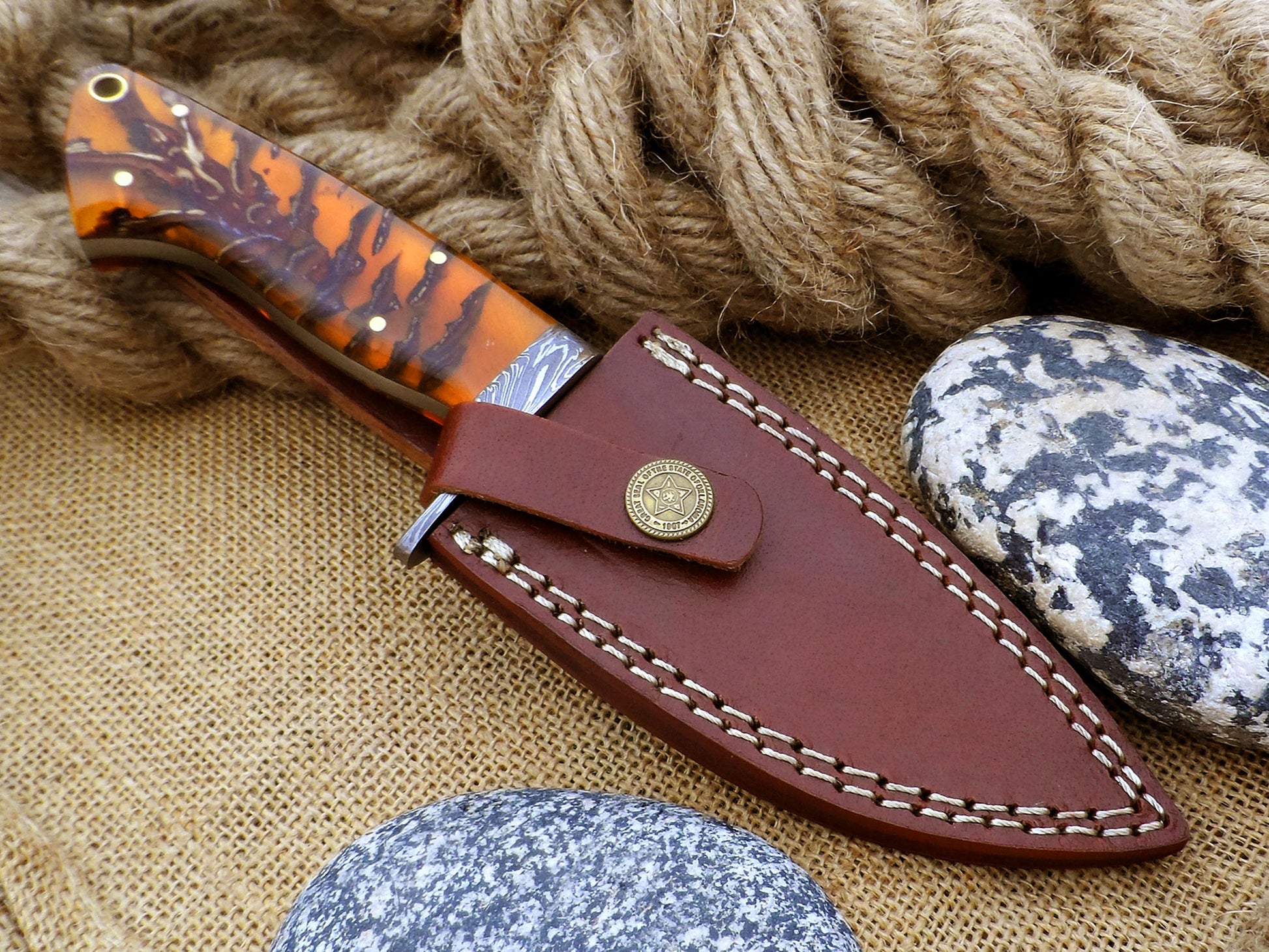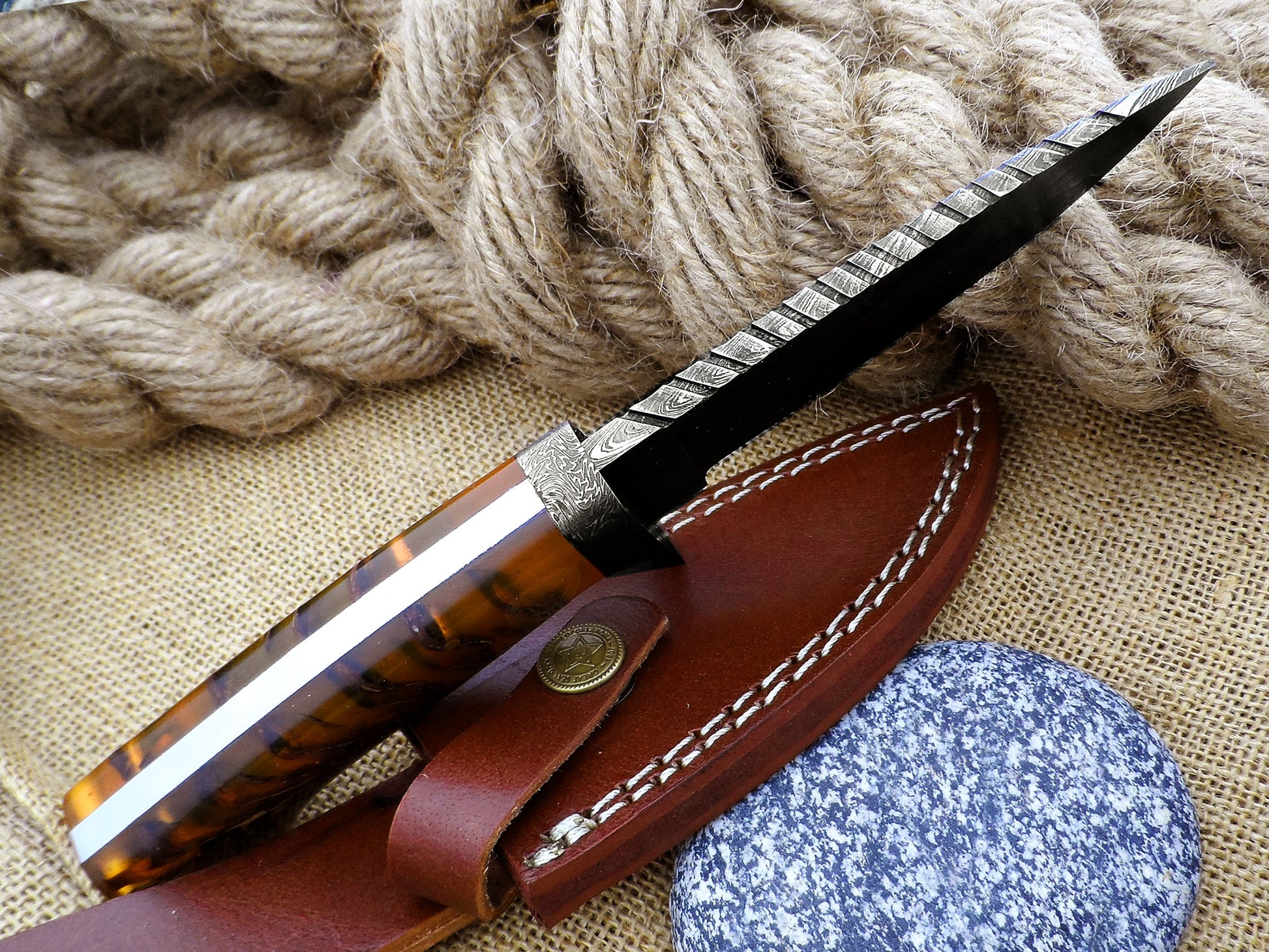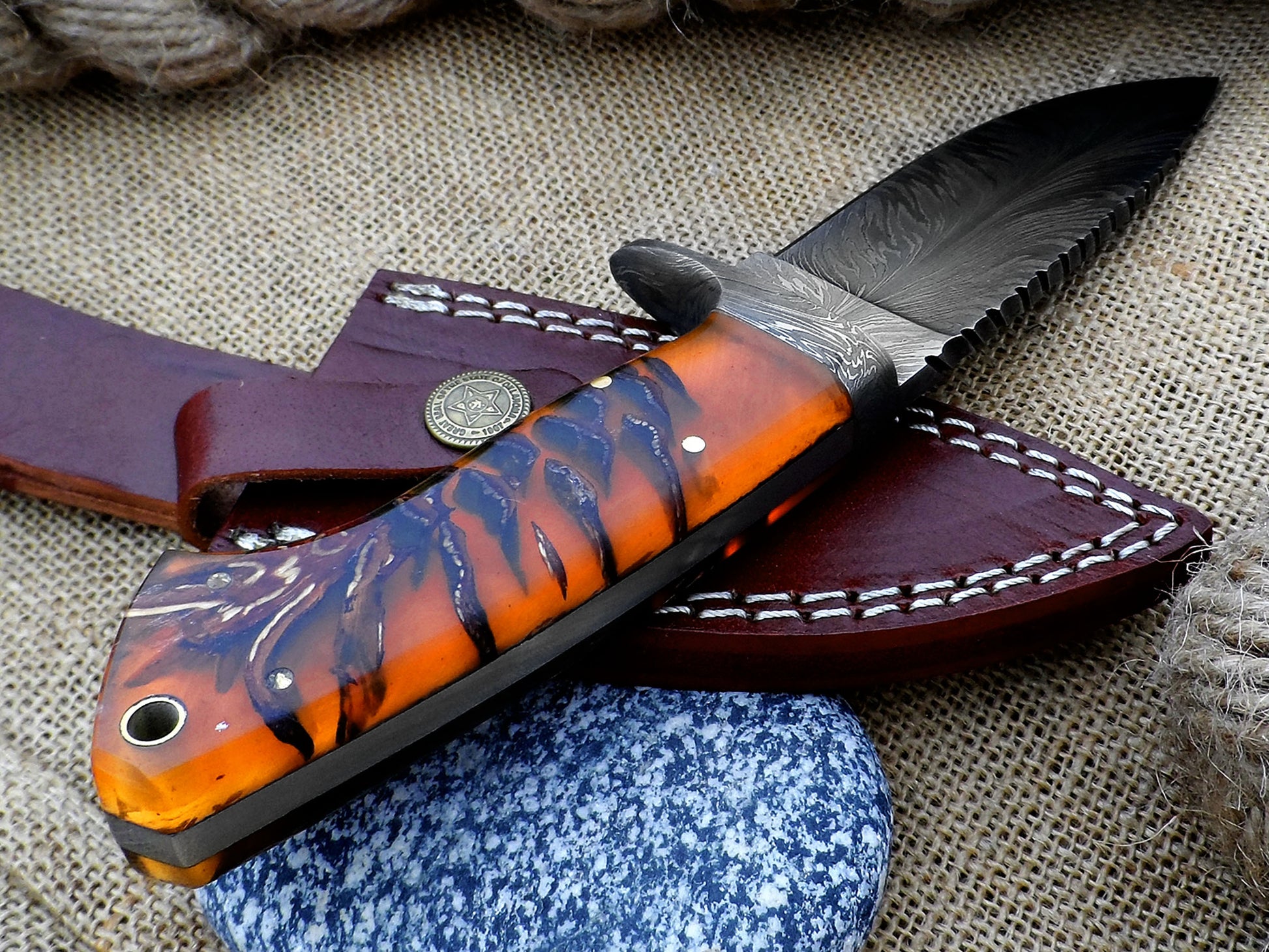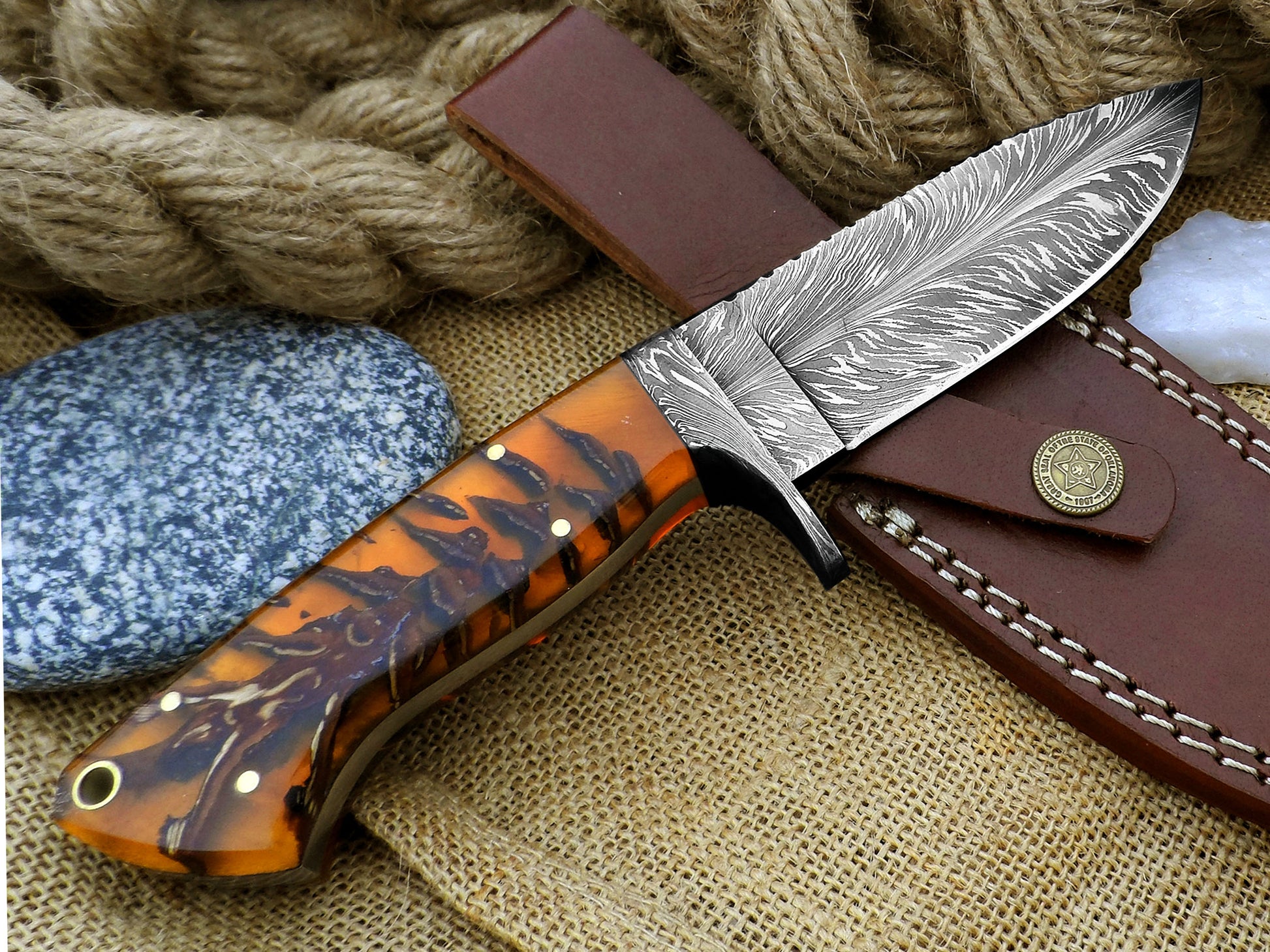 A handmade Damascus skinning knife has a handle made of stabilized pinecone resin. It features a feather pattern Damascus blade and comes with a custom leather sheath. This full tang hunting knife is made for hunters, collectors, and outdoor adventurers. It combines beauty with high performance in the field.