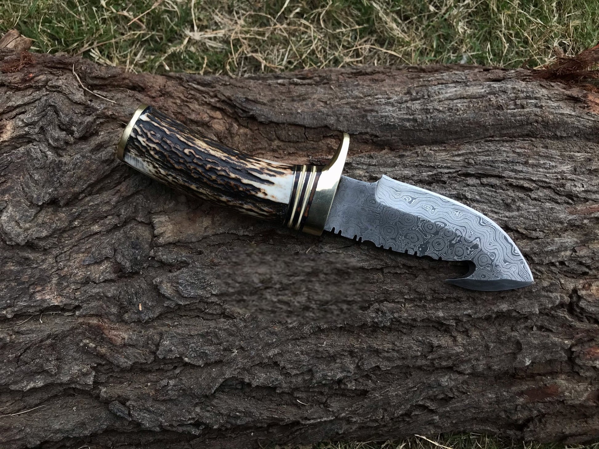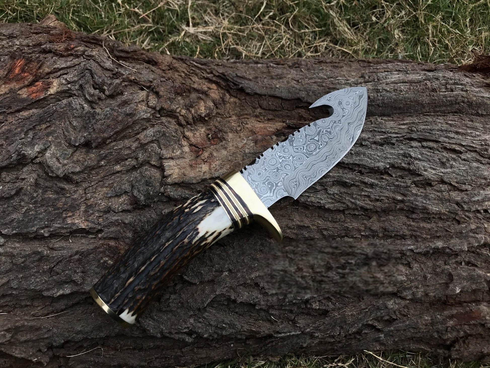 This knife has a stag horn handle, a brass guard, and a hand-forged Damascus steel blade. It also has a gut hook tip. This design offers accuracy, management, and robust durability for all outdoor tasks..