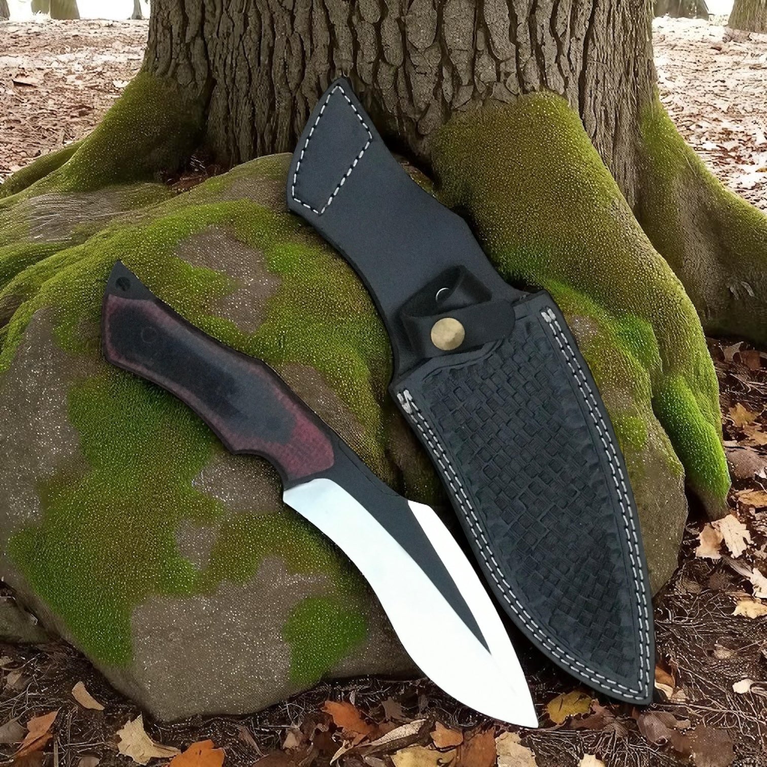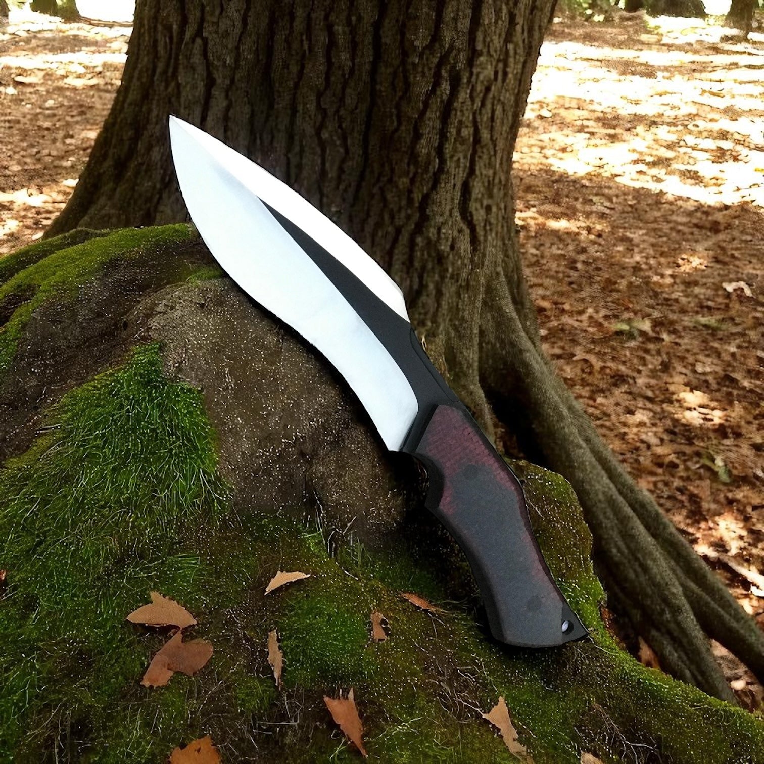 At 8 inches long, the blade’s curve gives you balance, power, and versatility. The 5-inch Micarta handle — red-black toned and textured for grip — doesn’t just look bold, it holds steady through wet, cold, or muddy conditions. Whether you’re batoning logs or prepping a fire-starting feather stick, this knife performs.