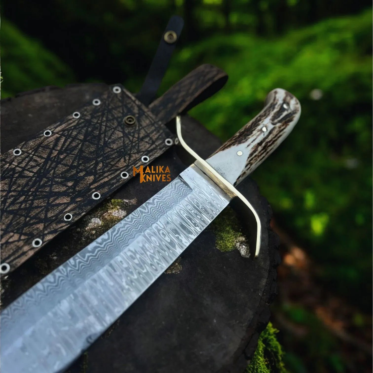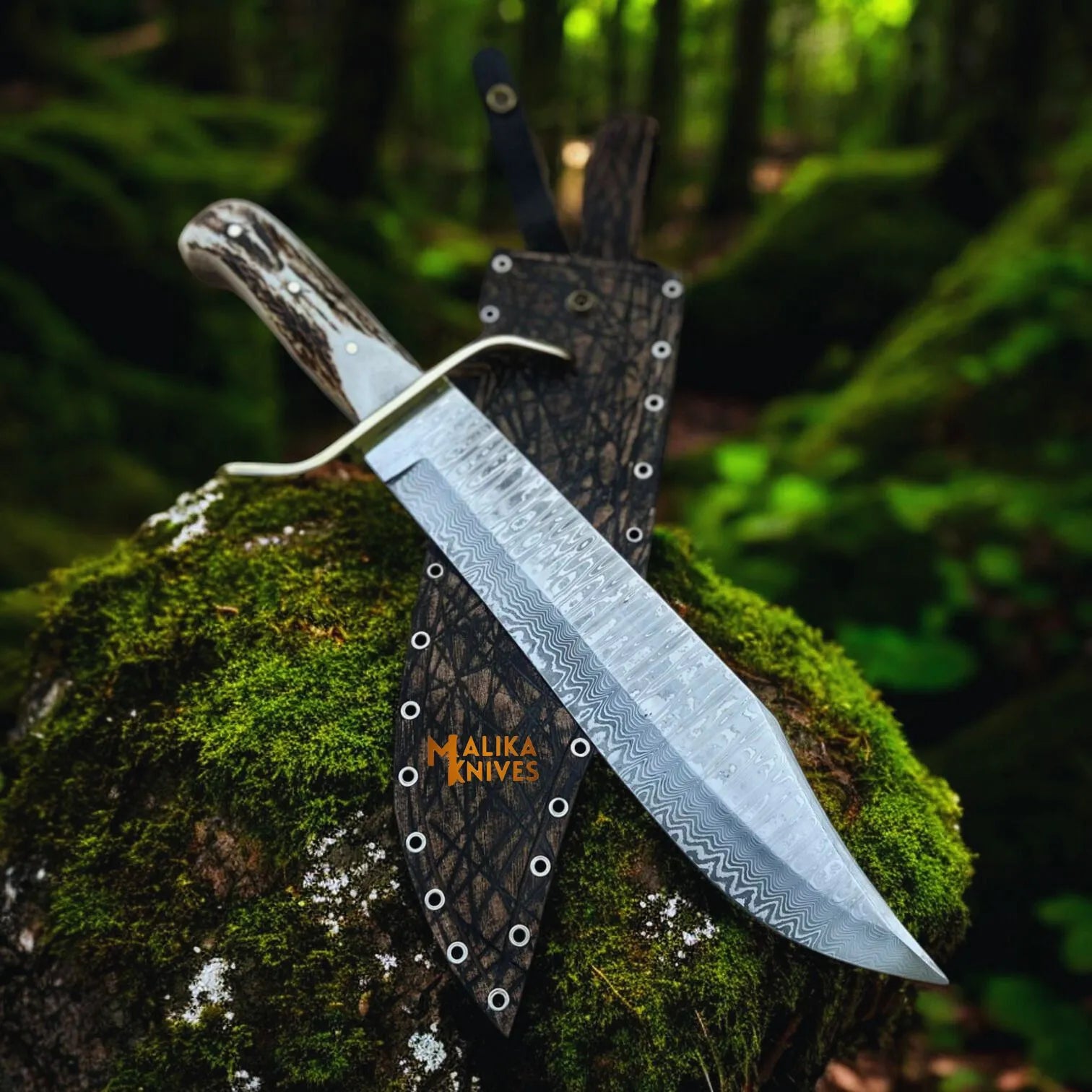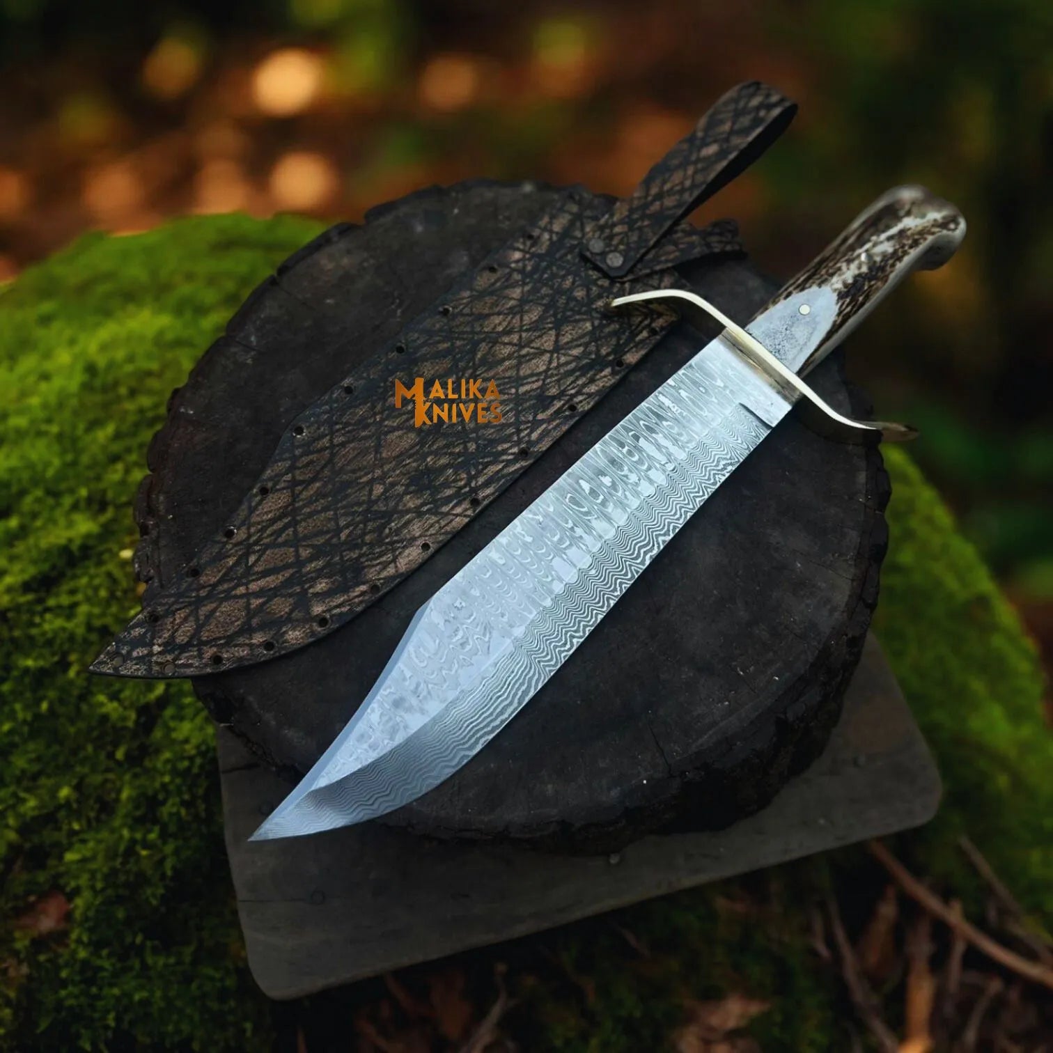 Experience the ultimate in craftsmanship with Malika Knives handmade SS Damascus stag Hunting bowie knife. It features a classic stag handle and a razor-sharp blade. The full tang construction makes it an essential tool for outdoor enthusiasts, collectors, and survivalists. The genuine stag horn handle has a unique texture that provides a comfortable and secure grip, even in wet or slippery conditions. The traditional style and premium materials make this bowie knife a one-of-a-kind piece. Plus, the included leather sheath allows for safe and easy transport. Add this high-quality Damascus bowie knife to your collection today and take your outdoor adventures to the next level!