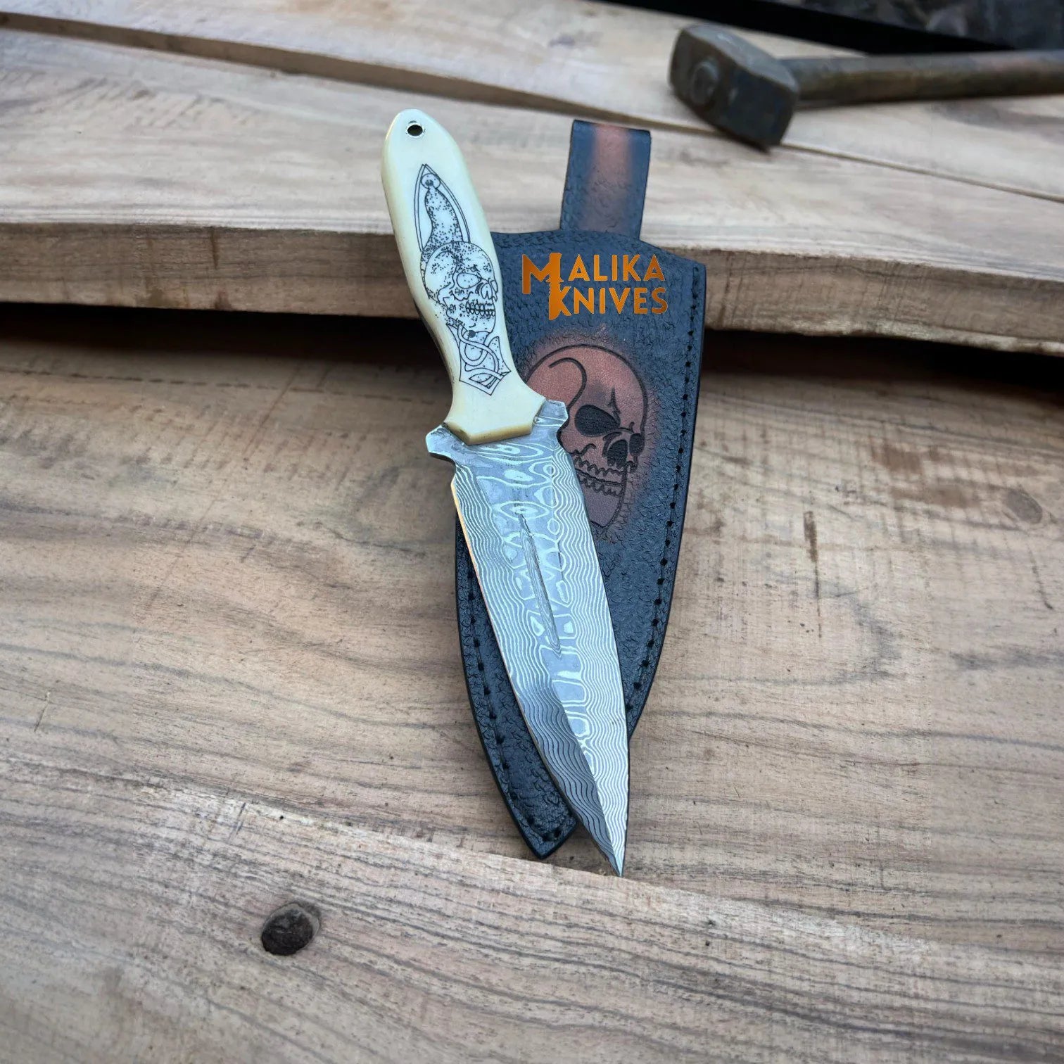 Tactical Dagger knife-SS Damascus-Skull Engraved Camel bone Handle -Custom Skull Leather Sheath-1205