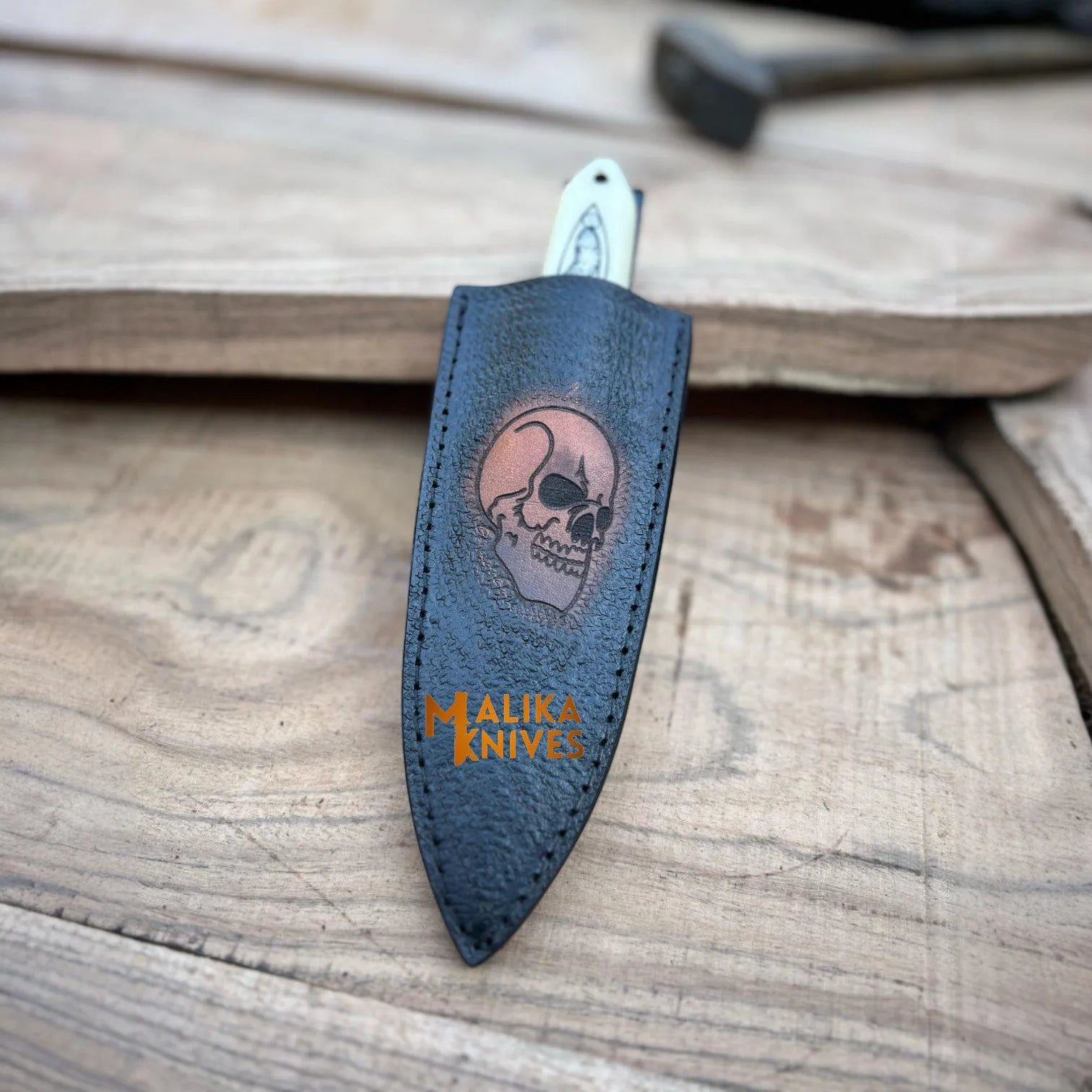 ? Custom Leather Sheath with Skull Engraving – A rugged, hand-stitched sheath designed for secure carry, featuring a bold, engraved skull motif.